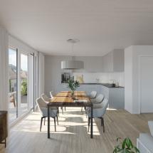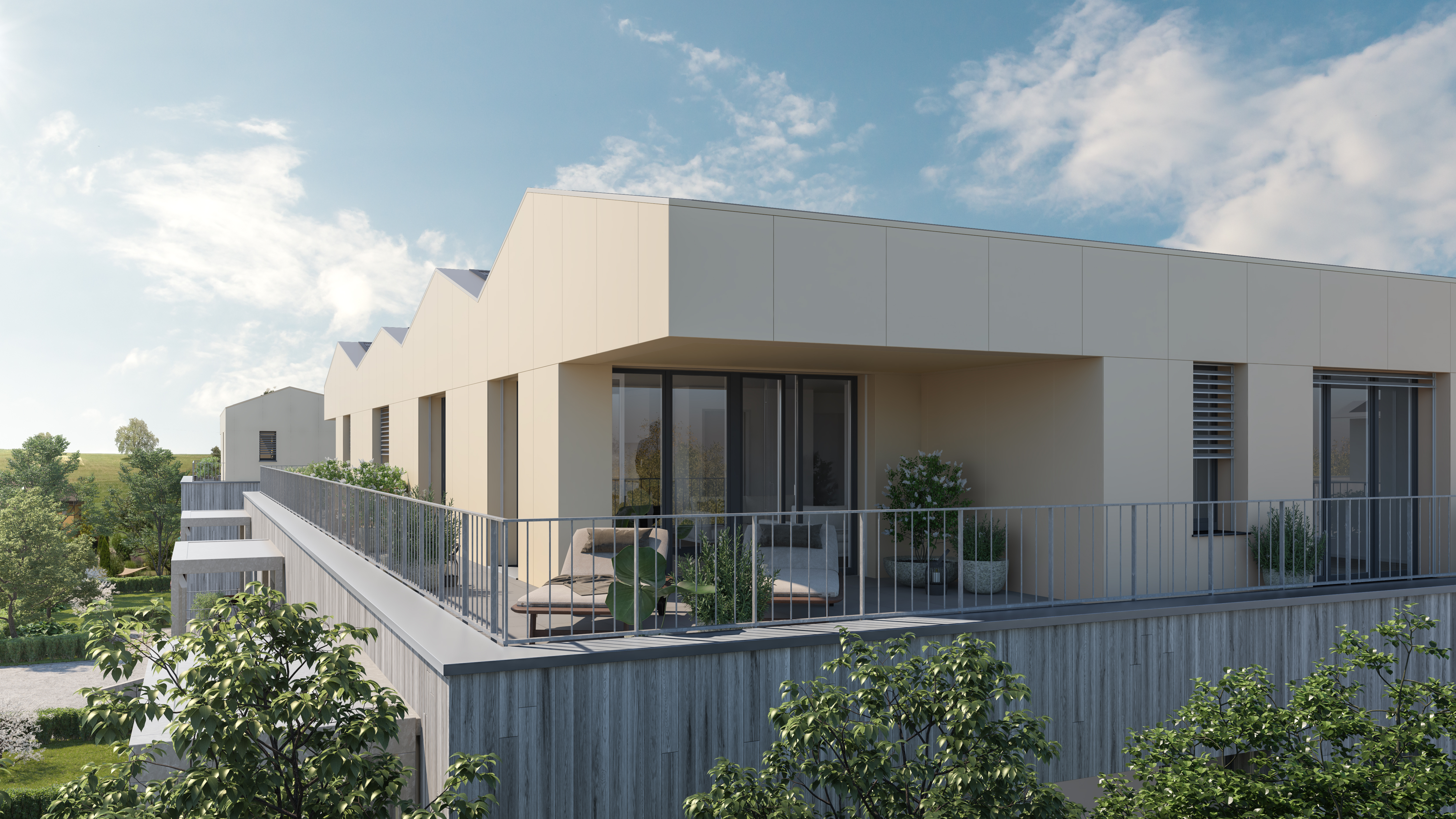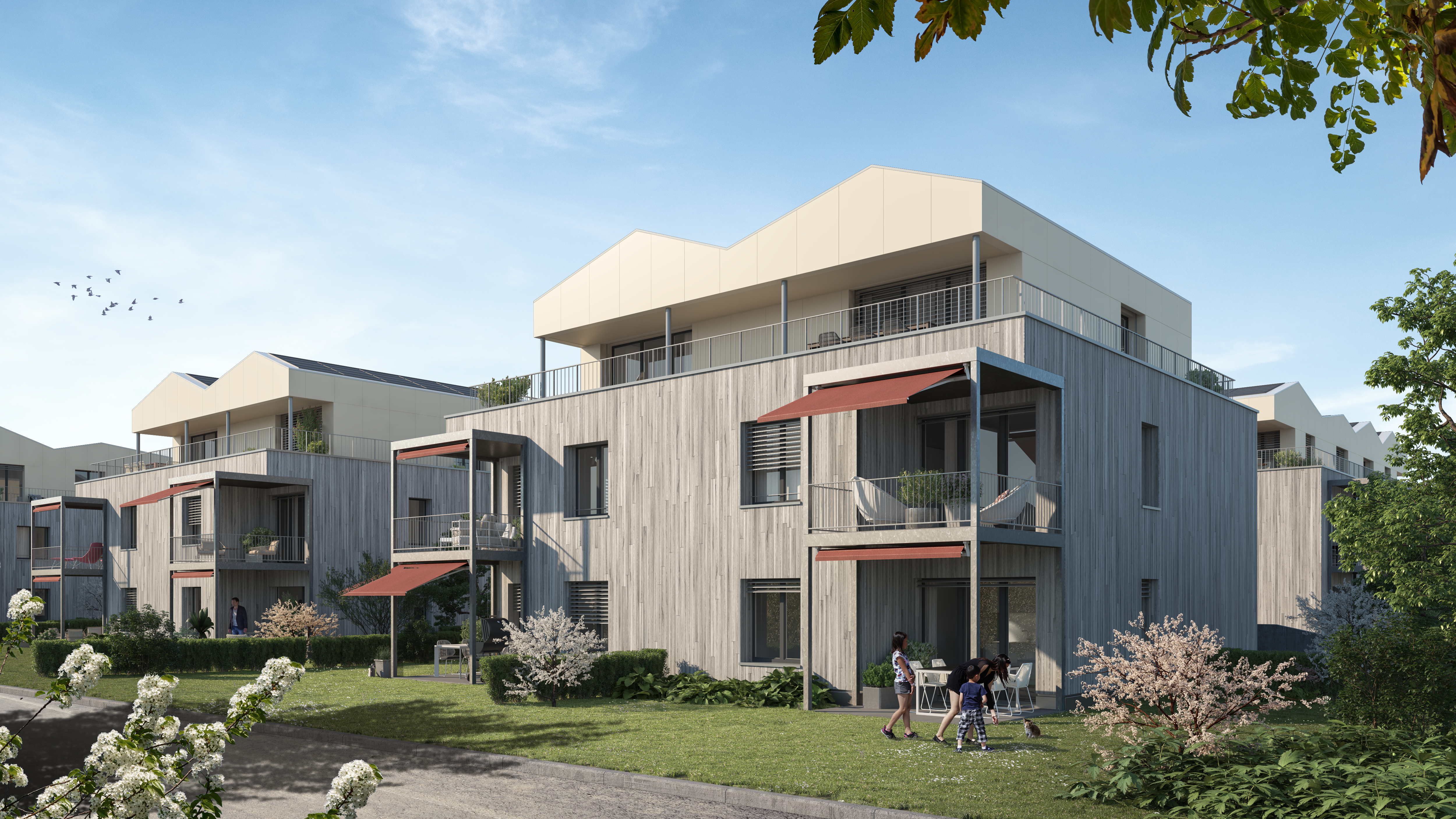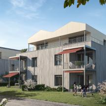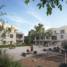 In Lotzwil realisieren wir elf Wohneinheiten. Total 80 Miet- und Eigentumswohnungen werden in Holzbauweise gebaut. Das Herzstück der Überbauung ist der zentral gelegene öffentliche Platz. Die Gebäude sind unterschiedlich in Ausrichtung und Erschliessung angeordnet. Die insgesamt sieben Gebäudetypen verfügen über eine individuelle Architektur, welche sich unter anderem in Volumen, Ausrichtung und Grundrisstypologie voneinander unterscheiden. Auf diese Weise gelingt es dem Projekt, die unterschiedlichsten Bedürfnisse und Erwartungen je nach Lebenssituation abdecken zu können. Die Überbauung ist oberirdisch weitgehend autofrei. Auf dem Grundstück befinden sich lediglich einige Besucherparkplätze.